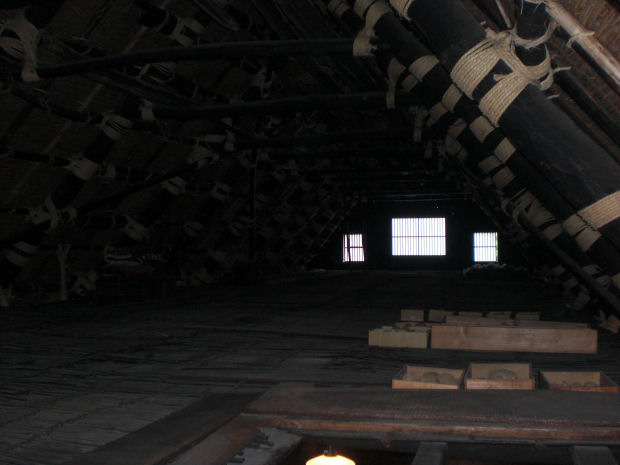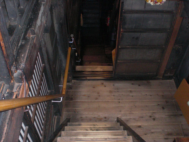 お賽銭箱のある辺りに立つと自動的にその部分だけ照明が点くようです。
